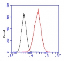 Flow Cytometry: HeLa cell line stained with ARG57060 anti-NNMT antibody [11G11] at 2-5 µg for 1x10^6 cells (red line). Secondary antibody: Goat anti-Mouse IgG Alexa fluor 488 conjugate. Isotype control antibody was Mouse IgG (black line).