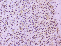 Immunohistochemistry: Paraffin-embedded Mouse brain tissue. Antigen Retrieval: Heat mediation was performed in Citrate buffer (pH 6.0) for 20 min. The tissue section was blocked with 10% goat serum. The tissue section was then stained with ARG42956 anti-NOVA1 antibody at 1 µg/ml dilution, overnight at 4°C.