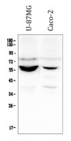 Western blot: 50 µg of sample under reducing conditions. U-87MG and Caco-2 whole cell lysates stained with ARG42956 anti-NOVA1 antibody at 0.5 µg/ml dilution, overnight at 4°C.