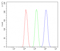 Flow Cytometry: Hepa 1-6 cells were blocked with 10% normal goat serum and then stained with ARG42975 anti-NOVA2 antibody (blue) at 1 µg/10^6 cells for 30 min at 20°C, followed by incubation with DyLight®488 labelled secondary antibody. Isotype control antibody (green) was Rabbit IgG (1 µg/10^6 cells) used under the same conditions. Unlabelled sample (red) was also used as a control.