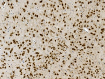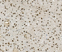 Immunohistochemistry: Paraffin-embedded Mouse brain tissue. Antigen Retrieval: Heat mediation was performed in EDTA buffer (pH 8.0). The tissue section was blocked with 10% goat serum. The tissue section was then stained with ARG42975 anti-NOVA2 antibody at 1 µg/ml dilution, overnight at 4°C.