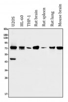 Western blot: 50 µg of sample under reducing conditions. U2OS, HL-60, THP-1, Rat brain, Rat spleen, Rat lung and Mouse brain lysates stained with ARG42975 anti-NOVA2 antibody at 0.5 µg/ml dilution, overnight at 4°C.