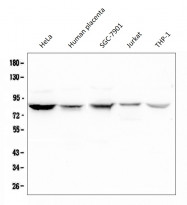 Western blot: 50 µg of samples under reducing conditions. HeLa, Human placenta, SGC-7901, Jurkat and THP-1 cell lysates stained with ARG59898 anti-NOX5 antibody at 0.5 µg/ml, overnight at 4°C.