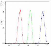 Flow Cytometry: HepG2 cells were blocked with 10% normal goat serum and then stained with ARG43116 anti-NR1I2 / PXR antibody (blue) at 1 µg/10^6 cells for 30 min at 20°C, followed by incubation with DyLight®488 labelled secondary antibody. Isotype control antibody (green) was rabbit IgG (1 µg/10^6 cells) used under the same conditions. Unlabelled sample (red) was also used as a control.