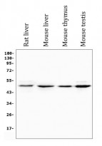 Western blot: 50 µg of sample under reducing conditions. Rat liver, Mouse liver, Mouse thymus and Mouse testis lysates stained with ARG43116 anti-NR1I2 / PXR antibody at 0.5 µg/ml dilution, overnight at 4°C.