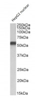 Western blot: 35 µg of HepG2 nuclear lysate (in RIPA buffer) stained with ARG58759 anti-NR5A2 antibody at 1 µg/ml dilution. Primary incubation was 1 hour. Detected by chemiluminescence.