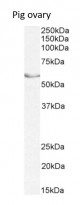 Western blot: 35 µg of Pig ovary lysate (in RIPA buffer) stained with ARG58759 anti-NR5A2 antibody at 0.3 µg/ml dilution. Primary incubation was 1 hour. Detected by chemiluminescence.