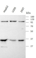 Western blot: HepG2, U20S and 293T stained with ARG44175 anti-NUBP1 antibody at 0.5 μg/mL dilution.