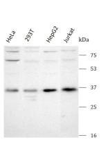 Western blot: HeLa, 293T, HepG2 and Jurkat stained with ARG44130 anti-NUDT5 antibody at 0.5 μg/ml dilution.