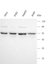 Western blot: Hela, K562, HepG2 and A549 stained with ARG44115 anti-NUP54 antibody at 0.25 μg/ml dilution.