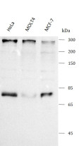 Western blot: HeLa, MOLT4 and MCF-7 stained with ARG44062 anti-Ninein / NIN antibody at 0.5 μg/mL dilution.