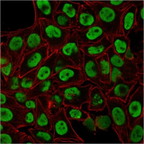 Immunofluorescence: Paraformaldehyde-fixed HeLa cells stained with ARG56179 anti-Nuclear antigen antibody [235-1] (green) and counterstained with Phalloidin (red).