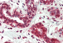 Immunohistochemistry: Paraffin-embedded Human breast tissue. Antigen Retrieval: Steam tissue section in Citrate buffer (pH 6.0). The tissue section was stained with ARG64105 anti-Nur77 / TR3 antibody at 5 µg/ml dilution followed by AP-staining.