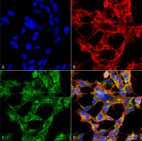Immunofluorescence: 5% Formaldehyde fixed (5 min) HEK293 cells stained with ARG22637 anti-O-GlcNAc antibody [9H6] at 1:50 for 30 - 60 min at RT. Secondary Antibody: Goat anti-Mouse (Alexa Fluor 488) at 1:1500 for 30 - 60 min at RT. Counterstain: Phalloidin Alexa Fluor 633 F-Actin stain; DAPI (blue) nuclear stain. (A) DAPI (blue) nuclear stain. (B) Phalloidin Alex Fluor 633 F-Actin stain. (C) Primary antibody (D) Composite. .