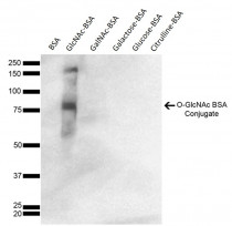 Western blot: 2.0 µg of BSA, GlcNAc-BSA, GalNAc-BSA, Galactose-BSA, Glucose-BSA, and Citrulline-BSA stained with ARG22637 anti-O-GlcNAc antibody [9H6] at 1:1000 for 2 hours at RT.