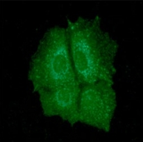 Immunoflorescense: Hep3B cell line stained with ARG56993 anti-OAT antibody [23A2] at 1:100 (Green).