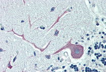 Immunohistochemistry: Paraffin-embedded Human cerebellum tissue. Antigen Retrieval: Steam tissue section in Citrate buffer (pH 6.0). The tissue section was stained with ARG63427 anti-ORP1 antibody at 5 µg/ml dilution followed by AP-staining.