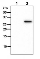 Western blot: 10 µg of 1) 293T cell lysate, 2) OSTF1 Transfected 293T cell lysate stained with ARG56974 anti-OSTF1 antibody [9G4] at 1:1000.