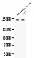 Western blot: 50 µg of Rat cardiac muscle and 40 µg of 293T whole cell lysate stained with ARG59222 anti-Otoferlin antibody at 0.5 µg/ml dilution.