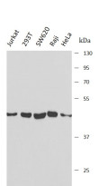 Western blot: Jurkat, 293T, SW620, Raji and HeLa stained with ARG44372 anti-PAICS / PAIS antibody at 1:1000 dilution.