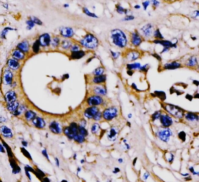 Immunohistochemistry: Human appendiceal adenocarcinoma stained with ARG45626 anti-PAR-3 / PARD3 antibody at 2 μg/ml dilution.