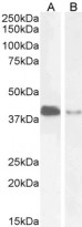 Western blot: 35 µg of Jurkat (A) and U251 (B) cell lysates (in RIPA buffer) stained with ARG63398 anti-PARD6A / PAR6 antibody at 2 µg/ml dilution and incubated at RT for 1 hour.