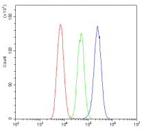 Flow Cytometry: U-87MG cells were blocked with 10% normal goat serum and then stained with ARG43089 anti-PCDH15 antibody (blue) at 1 µg/10^6 cells for 30 min at 20°C, followed by incubation with DyLight®488 labelled secondary antibody. Isotype control antibody (green) was rabbit IgG (1 µg/10^6 cells) used under the same conditions. Unlabelled sample (red) was also used as a control.