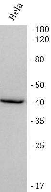 Western blot: Hela stained with ARG45936 anti-PDCD2 antibody at 0.5 μg/ml dilution.