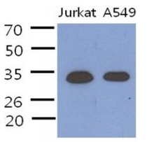 Western blot: 40 µg of Jurkat and A549 cell lysates stained with ARG57038 anti-PDCL3 antibody [8F9] at 1:1000.
