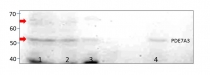 Western blot: 1) SKNMBE, 2) MCF7, 3) Human testis, and 4) Rat testis stained with ARG10807 anti-PDE7A antibody.