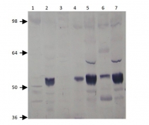 Western blot: 1) Lung, 2) Kidney, 3) Testis, 4) Pancreas, 5&7) Heart, and 6) Brain lysates stained with ARG10807 anti-PDE7A antibody at 1:500 dilution.