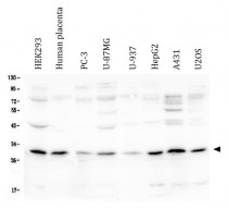 Western blot: 50 µg of sample under reducing conditions. HEK293, Human placenta, PC-3, U-87MG, U-937, HepG2, A431 and U2OS whole cell lysates stained with ARG42967 anti-PEF1 / Peflin antibody at 0.5 µg/ml dilution, overnight at 4°C.