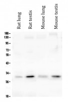 Western blot: 50 µg of sample under reducing conditions. Rat lung, Rat testis, Mouse lung and Mouse testis lysates stained with ARG42967 anti-PEF1 / Peflin antibody at 0.5 µg/ml dilution, overnight at 4°C.