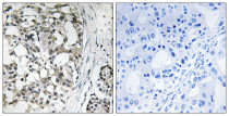 Immunohistochemistry: Paraffin-embedded Human breast carcinoma tissue stained with ARG66576 anti-PEX14 antibody. The picture on the right was blocked with the synthetic peptide.