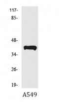 Western blot: A549 cell lysate stained with ARG66576 anti-PEX14 antibody.