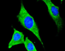 Immunofluorescence: SH-SY5Y cells were fixed in paraformaldehyde and permeabilized with 0.25% Triton X100/PBS. Cells were stained with ARG42606 anti-PFKM antibody (green). DAPI (blue) for nuclear staining.