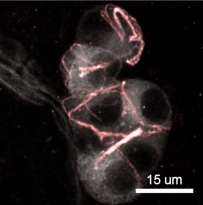 Immunohistochemistry: Thick section of Mouse nose stained with ARG10815 anti-PGCG antibody (red). The antibody labels ciliated subcellular structures on the neurons. White/gray: Grueneberg ganglion neurons. .