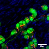 Immunohistochemistry: Whole-mount Mouse nose stained with ARG10815 anti-PGCG antibody (red). Green: Grueneberg ganglion neurons. Blue: Nuclei.