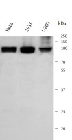 Western blot: Hela, 293T and U2OS stained with ARG44575 anti-PHF17 / JADE1 antibody at 0.5 μg/mL dilution.