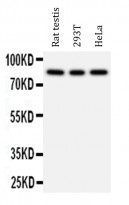Western blot: 50 µg of samples under reducing conditions. Rat testis, 293T and HeLa whole cell lysates stained with ARG40830 anti-PI3 Kinase p85 beta antibody at 0.5 µg/ml, overnight at 4°C.