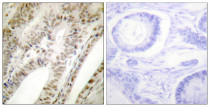 Immunohistochemistry: Paraffin-embedded Human tonsil tissue stained with ARG66699 anti-PML antibody. The picture on the right is blocked with the synthetic peptide.
