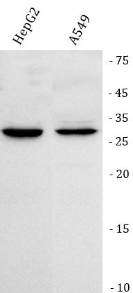 Western blot: HepG2 and A549 stained with ARG45591 anti-PMM2 antibody at 0.5 μg/ml dilution.