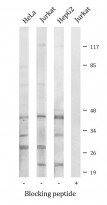 Western blot: HeLa, Jurkat and HepG2 cell lysates stained with ARG66721 anti-POFUT1 antibody. The lane on the right is blocked with the synthetic peptide.