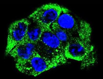 Immunofluorescence: HepG2 cells stained with ARG55442 anti-PON2 antibody (green). DAPI (blue) for nuclear staining.