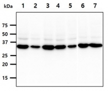 Western blot: 40 µg of 1) HeLa cell lysate, 2) A431 cell lysate, 3) 293T cell lysate, 4) HepG2 cell lysate, 5) U87MG cell lysate, 6) PC3 cell lysate, 7) WiDr cell lysate stained with ARG57077 anti-PPA1 / Pyrophosphatase antibody [4G4] at 1:1000.