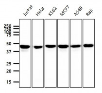 Western blot: 40 µg of Jurkat, HeLa, K562, MCF7, A549 and Raji cell lysates stained with ARG56912 anti-PPM1A antibody [p6c7] at 1:1000 dilution.