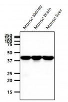 Western blot: 40 µg of Mouse kidney, Mouse brain and Mouse liver lysates stained with ARG56912 anti-PPM1A antibody [p6c7] at 1:1000 dilution.