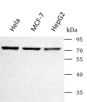 Western blot: Hela, MCF-7 and HepG2 stained with ARG43928 anti-PPP2R5D antibody at 0.5 μg/mL dilution.