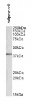 Western blot: 35 µg of Human Adipose cell lysate stained with ARG64988 anti-PRKCDBP antibody at 0.1 µg/ml dilution. Primary incubation was 1 hour.