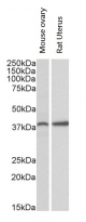 Western blot: 35 µg of Mouse ovary and Rat Uterus lysate stained with ARG64988 anti-PRKCDBP antibody at 0.3 µg/ml dilution. Primary incubation was 1 hour.